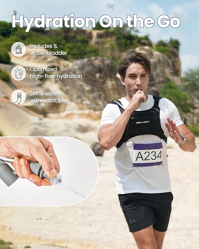 - Stay Hydrated on the Run – Zelvot running hydration vest includes a 1L water bladder made from food-grade, BPA & PVC-free materials. The high-flow bite valve allows hands-free drinking to keep you hydrated without slowing down. Simply pull up the cap, bite the mouthpiece to sip, and push back to stop the flow. The 1L capacity offers more hydration than 500ml flasks while avoiding the weight of 2–3L bladders. Perfect for mid-distance runs, cycling, or hiking.