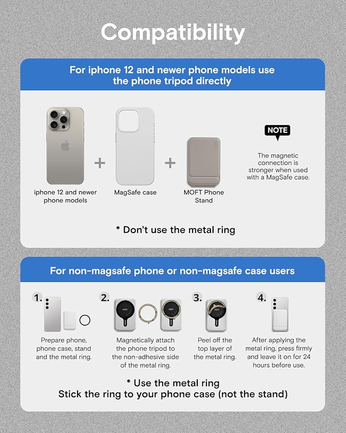 - Universal Compatibility: MOFT Phone Tripod fits iPhone 17/16/15/14/13/12 series and MagSafe cases. For other devices (such as Samsung) and non-magnetic cases, the phone stand can be attached using the included metal ring. Please check the product dimensions (3.8in X 2.5in X 0.27in) to ensure it fits the back of your phone without obstructing the camera. The slim design ensures your phone’s lenses stay unobstructed-perfect for Instagram-worthy shots at cafes, parks, or business events.