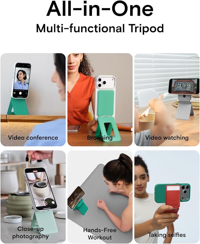 - Multifunctional Angle Adjustment: With its innovative design, this phone tripod wallet offers versatile angle adjustment. In floating mode, it’s your ideal group photo sidekick, allowing you to capture memorable moments with friends and family. In landscape mode, you get a vlogging tripod that works on any surface. Fold up its base, you can hold it as a phone tripod for vlogging on the go. It’s also a fully adjustable phone stand, providing comfort while watching videos or having FaceTime calls.