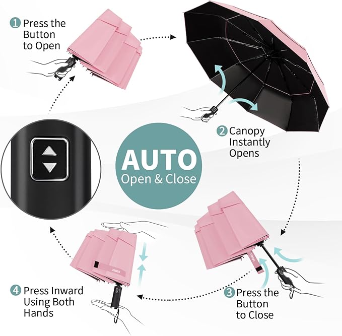 - 【Automatic Open/Close】One-touch auto-open/close makes this car umbrella a breeze to use, even with one hand. Whether you're hopping in and out of cars or carrying things, you'll stay dry and hassle-free. The quick-dry canopy lets you shake off water in seconds; stash the small umbrella quickly without a mess.