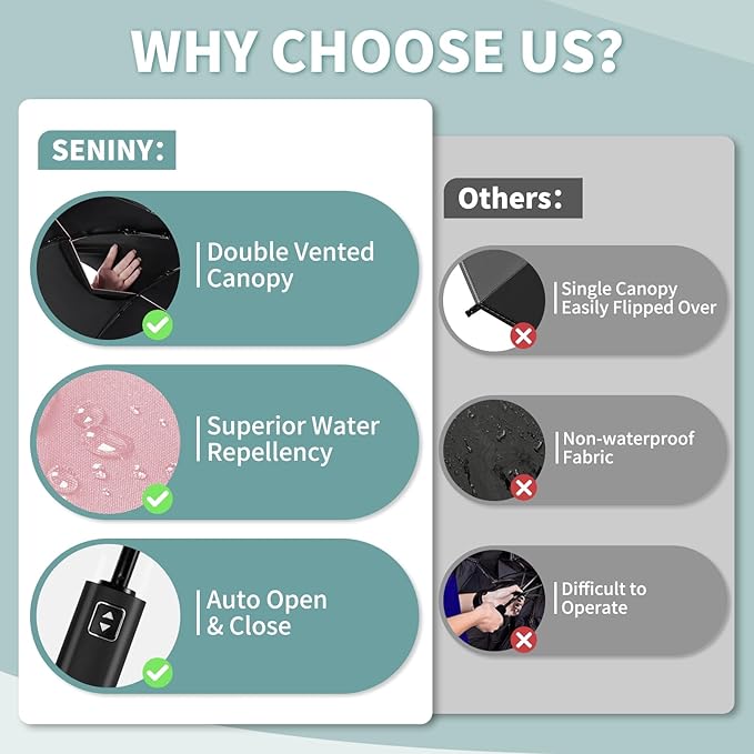 - 【All-Round Big Umbrella】Rain or shine, Seniny automatic umbrella has you covered! With a premium UPF 50+ coating, it blocks 99%+ of UV rays for ultimate sun protection. Plus, the sun umbrella is also built to withstand rain and snow—making it your all-weather essential for daily commutes and weekend adventures.