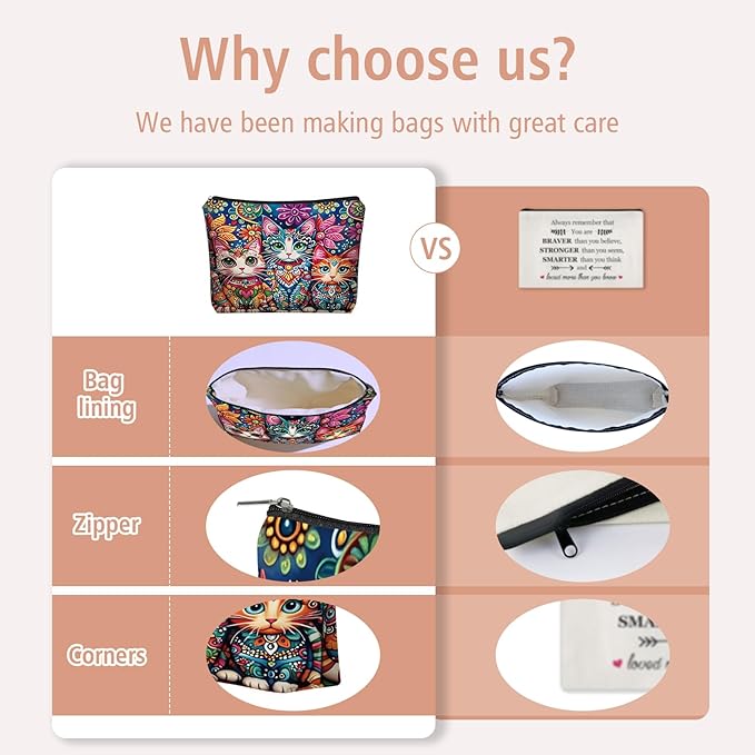 - ๐๐ข๐๐ญ๐ฌ: We also offer various styles with different sayings on other bags, which are perfect keepsakes and a great choice for holiday gifts. this boho cat themed cosmetic bag makes a thoughtful and stylish gift for women and girls, suitable for families, friends, sisters, colleagues, coworkers, girlfriends, aunts, moms, wives, daughters, teachers, and nieces.