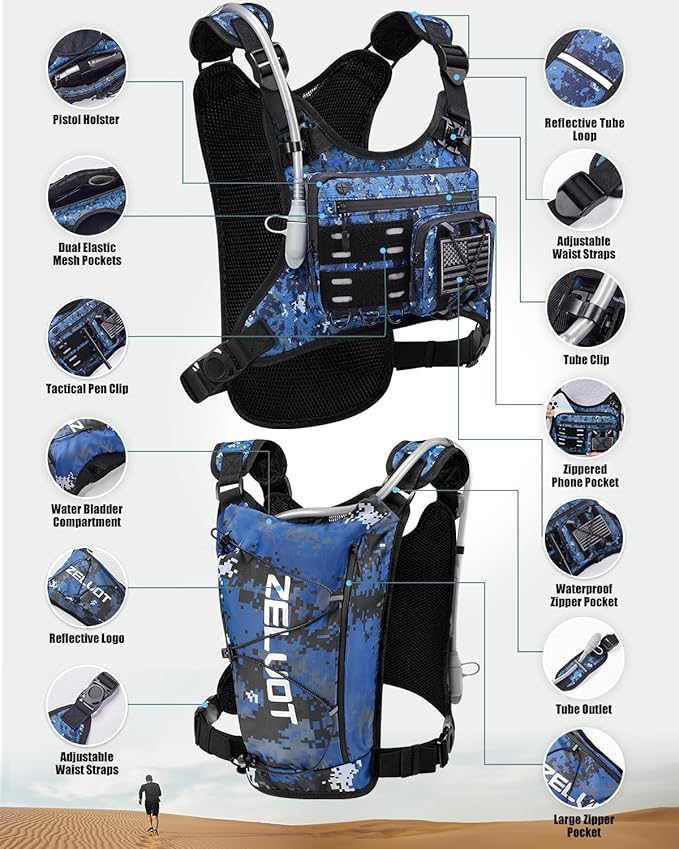 - Plenty of Storage - This chest bag features 3 waterproof zippered front pockets to securely hold essentials like your phone, keys, and energy gels. A detachable, bounce-free pistol holster ensures secure storage for small to mid-sized pistols, while the tactical pen slot keeps emergency gadgets within easy reach. Two large back pockets fit a water bladder, towel, extra clothing.
