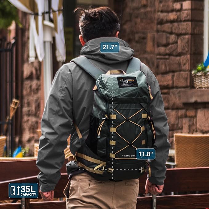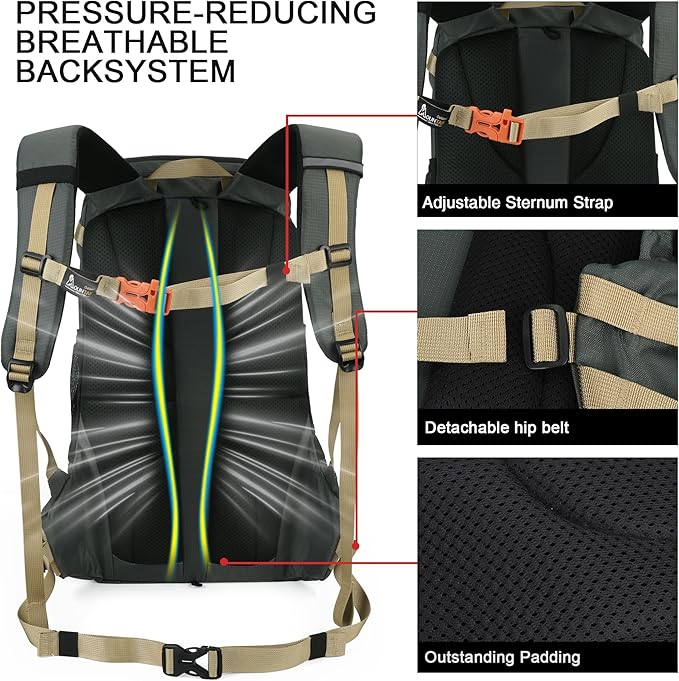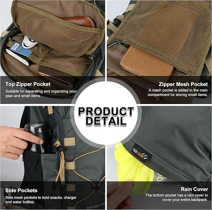 - Durable Material: This 35L hiking backpack is made of high-wear resistant fabric that resists scratches. The zippers and buckles are all YKK, Rain cover included.