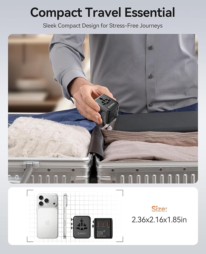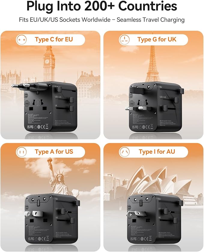 - 【Worldwide Power Adapter for Travel】ORICO universal travel adapter is equipped with 4 different plug types ((Type C/A/G/I) that could plug into the sockets of 200+ countries and regions across Europe, Asia, USA and Australia. This means that a tiny adapter can solve all the problems of converting plugs during your journey. so this travel essentials is suitable for your worldwide travel