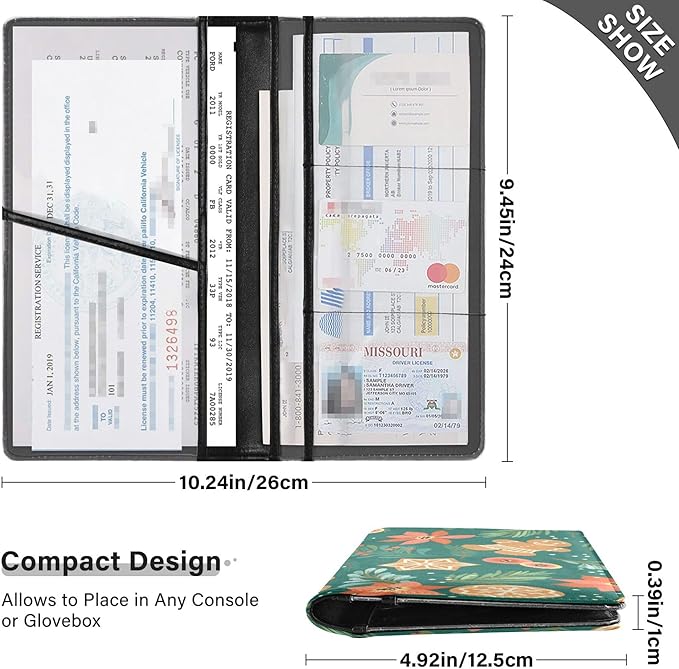 - Large Capacity: This elegant and chic registration holder for car will fit into glove compartments, sun visors, door holders, consoles, etc. Our auto insurance and registration card holder is precisely designed to fit all of your car documents.