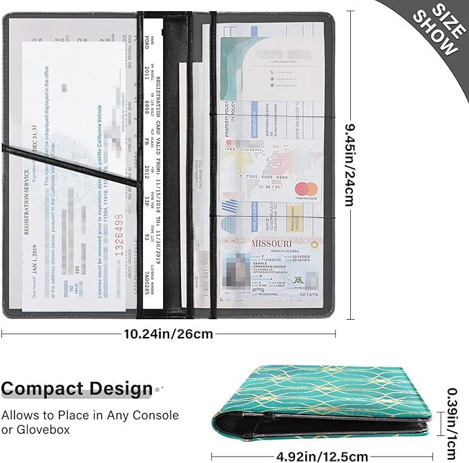 - Large Capacity: This elegant and chic registration holder for car will fit into glove compartments, sun visors, door holders, consoles, etc. Our auto insurance and registration card holder is precisely designed to fit all of your car documents.