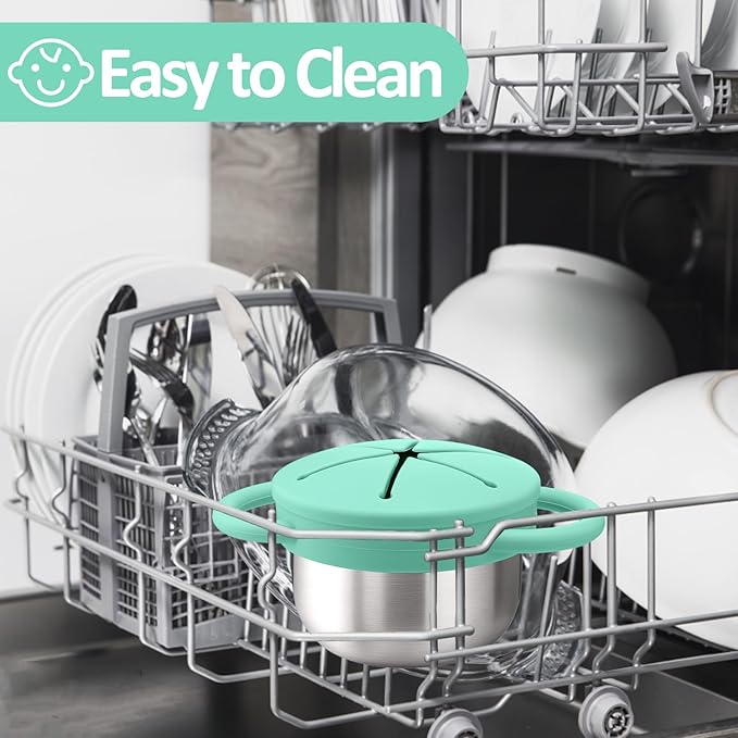 - Easy to Clean&Built to Last - Snack containers crafted from premium 304 stainless steel and food-grade silicone,each cup holds about 9 oz , these snack catchers are freezer-safe. Toddler snack containers are stain-proof, and dishwasher safe. Built to handle drops, throws, and every snack-happy moment life brings