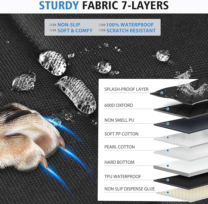 - 【Hard Bottom,Durable Material】This back seat extender for dogs is made of stronger but softer material. It is made of PU layer, which is flavorless and also waterproof. The surface is high-density firm Oxford cloth, more durable and easy to clean. Pearl cotton is sandwiched in the center, more soft. Thickened hollow board is more solid and not easy to bend. Encrypted and thickened webbing and lock buckle are more advanced and durable