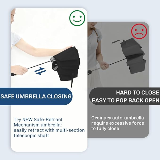 - 【Safe-Retract Mechanism Umbrella】Our unique no-rebound telescopic shaft moves smoothly and locks securely at every position while closing. This eliminates the problem of sudden pop-back, safe & Effortless Closing for Everyone. It's the ideal choice for anyone who values ease and safety—especially perfect for women, students, the elderly, and those with arthritis or joint concerns