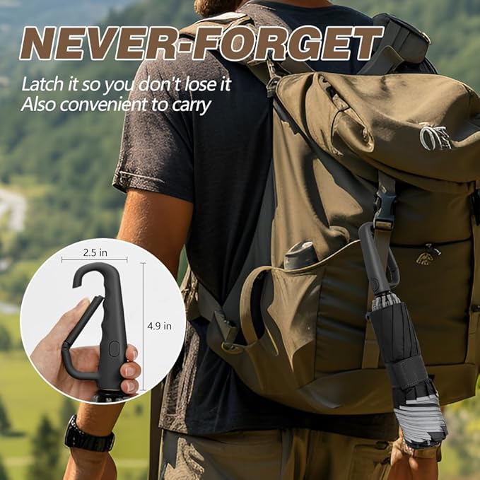 - 【Innovative Carabiner Clip Handle】Allows you to clip your strong umbrella to a variety of places, Backpack, Purse, Luggage, Handbag, Belt Loop, Golf Bag, Stroller, Bicycle, etc which keeps your umbrella from being lost or misplaced and without taking up too much space. Suitable for daily commuting, traveling, hiking, mountain climbing or the jungle
