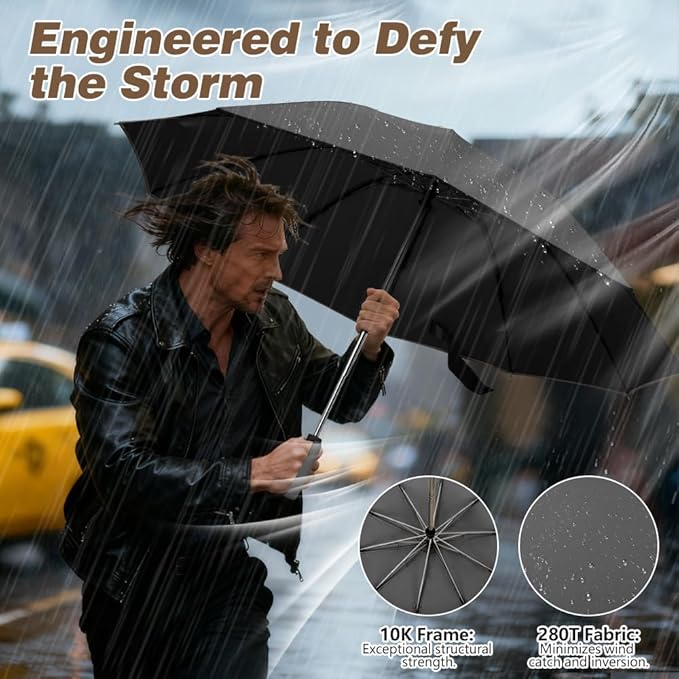 - 【Stormproof】With 10 reinforced aluminum ribs and flexible fiberglass, this umbrella stands strong in extreme weather. The 280T Pongee fabric effectively disperses wind pressure, ensuring unmatched durability