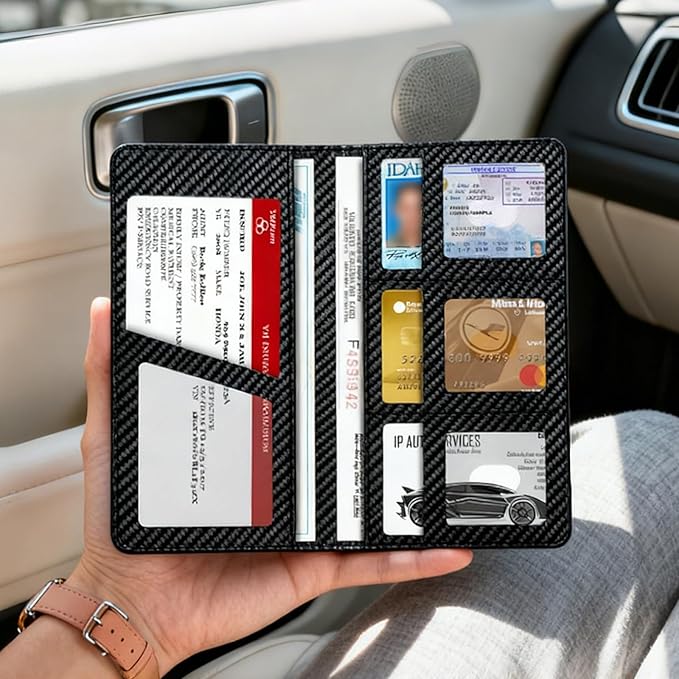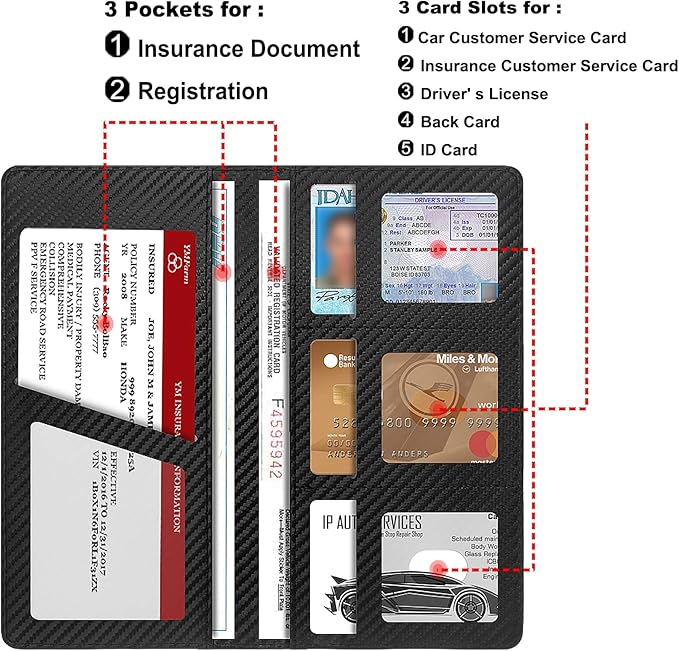 - 📁 Military-Grade Organization With 6 specialized compartments, this car insurance and registration card holder systematically stores licenses, insurance cards, and emergency contacts. The car document organizer features oversized pockets specifically designed for vehicle registration holder documents