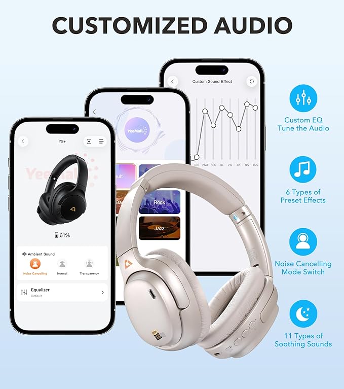 - CUSTOMIZE YOUR SOUND VIA APP: Personalize your sound with the 1Mii E700 over-ear Bluetooth headphones. Choose from preset EQ profiles, fine-tune bass and treble to match your taste, or relax with soothing sleep sounds. Perfect for music, travel, or winding down after a long day
