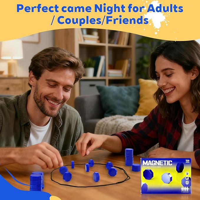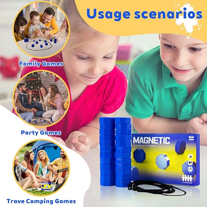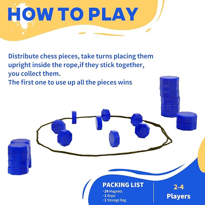 - Quick & Easy Rules: Players distribute magnetic pieces evenly and take turns placing them inside the circular game rope. If pieces stick together, the player retrieves all attached magnets. The first to place all pieces wins. Simple enough to learn in one minute