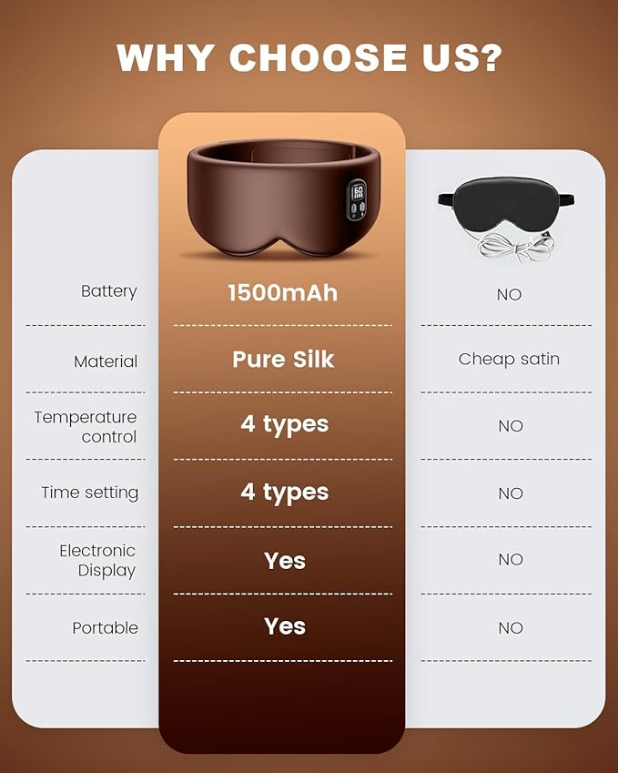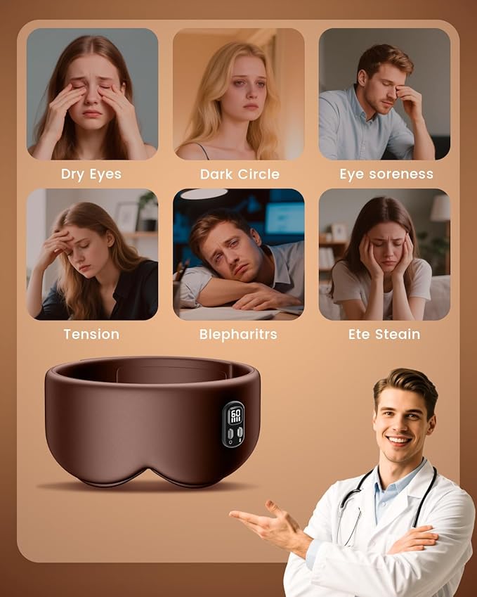 Heated Eye Mask - Cordless Eye Mask for Dry Eyes, Eye Relief, Improved Sleep, Timed Shutdown, 4 Temperature, Washable Eye Heating Pad for Travel, Removable for Cleaning - Brown