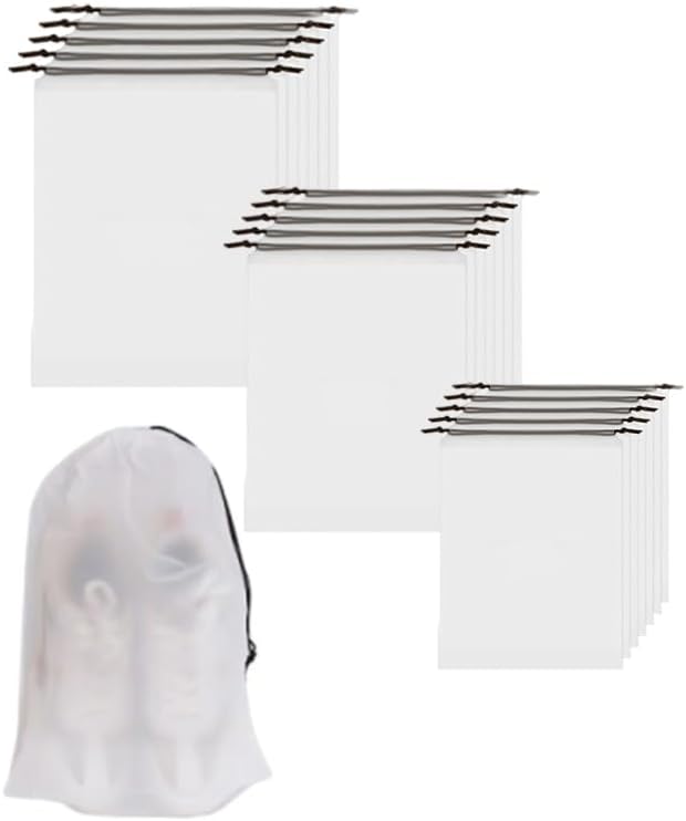 15 Pack Travel Shoe Bag, PE Waterproof Dustproof Clear Drawstring Shoe Organizer Bag Portable Travel Essentials for Men & Women Ideal for Luggage, Backpack, Gym & Daily Storage, Multi-Size