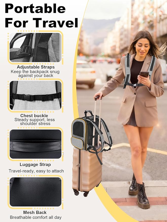 - 【Travel-Friendly Design】The backpacks is equipped with adjustable padded shoulder straps and chest buckles for a comfortable carrying sensation for the owner. This multi-functional pet backpack features a designed luggage strap on the back, making it easy to attach to a suitcase. It is suitable for short trips, visiting the vet, outdoor hiking, camping or city outings. It not only frees your hands but also keeps you close and safe with your furry companion.
