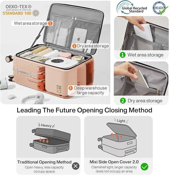 - 【One-Piece Side Opening Design】The design is different from the traditional way of opening and closing the suitcase in half, which is more convenient and less labor-saving. Mixi patent design, focus on luggage industry over 10 years, please believe Mixi brand power!