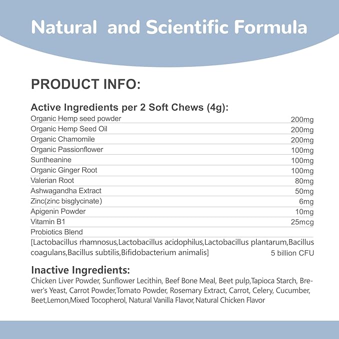 - Safe and Gentle. These soft calming chews for dogs are made of natural plant extracts, such as chamomile, passionflower, suntheanine, valerian root. Very safe and no side effect. With daily use, it can nurture a lasting sense of calm and help your dog be more happy and comfortable.