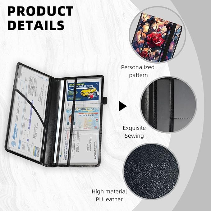 Car Registration and Insurance Holder PU Leather Vehicle Insurance and Registration Holders Wallet Case with Elastic Band Closure for ID Card, Driving Licence, Red Rose Stained Glass