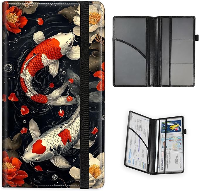 Car Registration and Insurance Holder PU Leather Vehicle Insurance and Registration Holders Wallet Case with Elastic Band Closure for ID Card, Driving Licence, Koi Fish Flowers