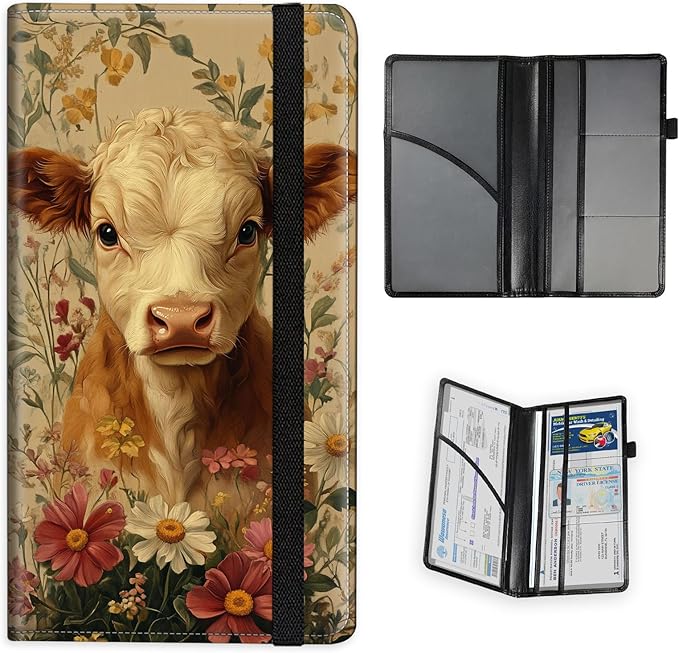 Car Registration and Insurance Holder PU Leather Vehicle Insurance and Registration Holders Wallet Case with Elastic Band Closure for ID Card, Driving Licence, Calf Flower Field