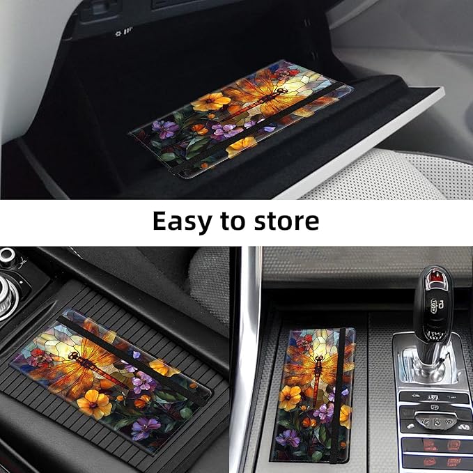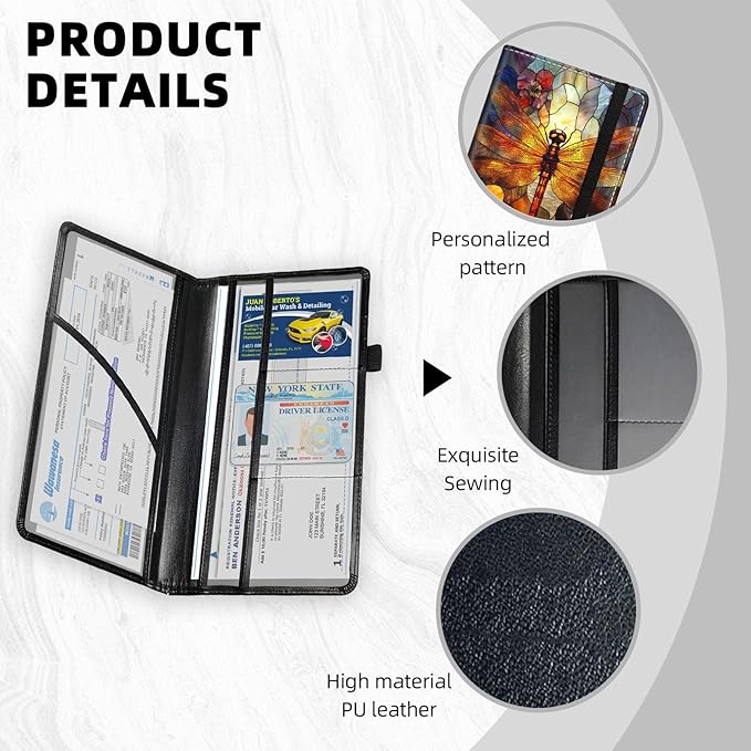 Car Registration and Insurance Holder PU Leather Vehicle Insurance and Registration Holders Wallet Case with Elastic Band Closure for ID Card, Driving Licence, Dragonfly Stained Glass