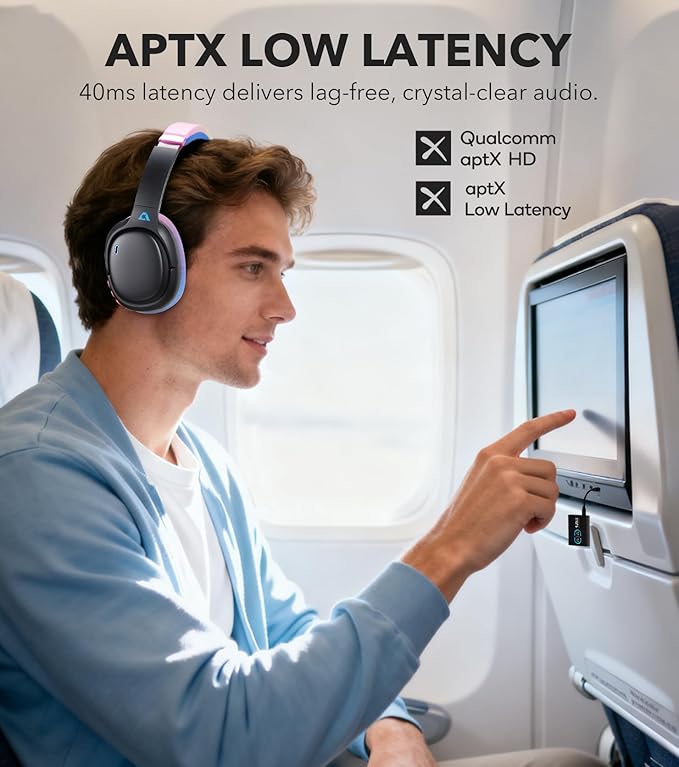 - STAY IN SYNC WITH APTX LOW LATENCY: The wireless Bluetooth headphones deliver smooth, immersive sound with only 40ms latency when paired with aptX Low Latency compatible transmitters. Ideal for TV watching or entertainment on an airplane