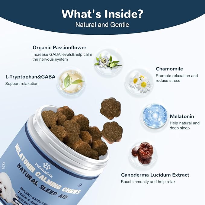 - Safe and Gentle. These soft calming chews for dogs are made of natural plant extracts, such as chamomile, passionflower, and ganoderma lucidum. Very safe and no side effect. With daily use, it can improve sleep quality and help your dog be more happy and comfortable.