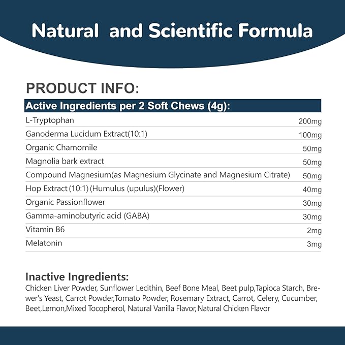 - Scientifically Vet-formulated. Our dog anxiety chews are vet-formulated and produced in facilities that meet FDA guidelines and strict GMP standards. Effective and safe for your dog's emotional health and sleep quality. If you have any questions, please contact us at any time.