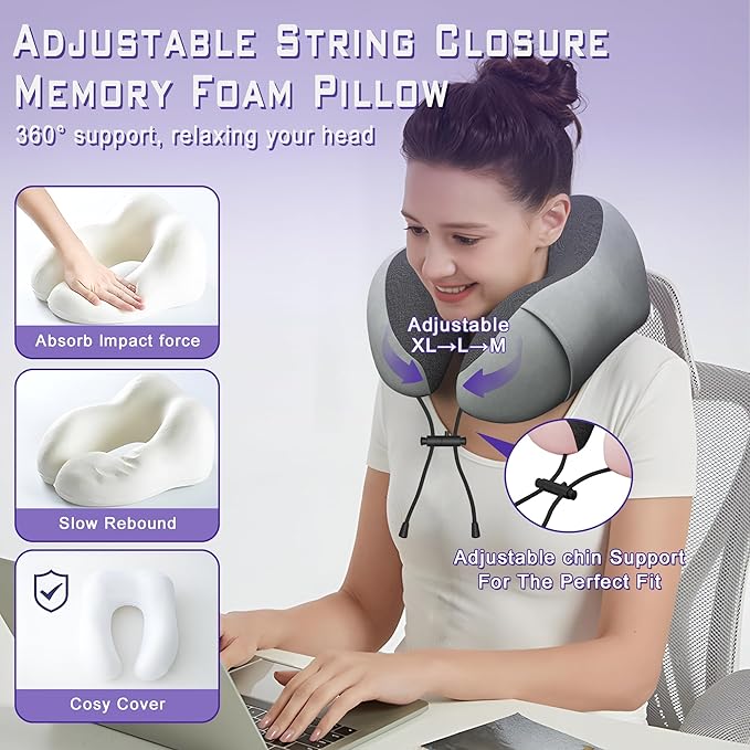 Neck Travel Pillow, Upgraded Memory Foam Pillow for Airplane, Machine Washable, Adjustable Flight Pillow, Suitable for Sleeping Airplane, Car, Office and Home (Grey)