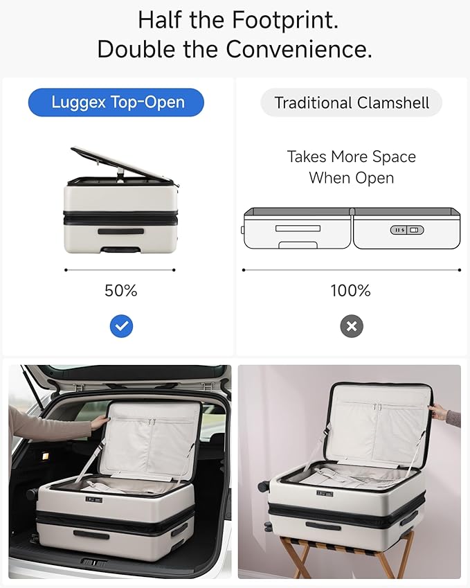 - 【Top Opening for Easy Access】Designed with a side-opening deep compartment, this large checked luggage can be opened vertically against a wall or in narrow aisles, saving valuable floor space while still allowing quick access to your luggage without fully unfolding it.