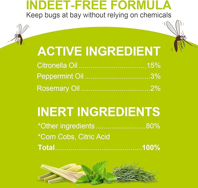 - Plant-based: The mosquito repellent utilizes plant extracts such as Citronella, Rosemary, Peppermint oil, and other natural ingredients, ensuring safety for both pets and children. It can be confidently used indoors and outdoors