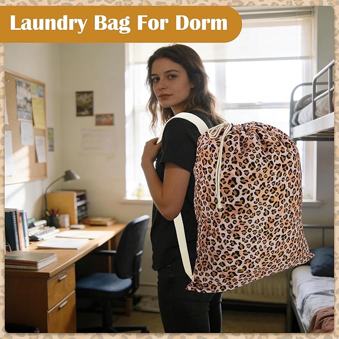 Canvas Laundry Bag with shoulder Strap 24" x 29", Large Drawstring Dirty Clothes Bag Washable Laundry Sack for College Dorm, Travel, Home, Camp (Leopard)