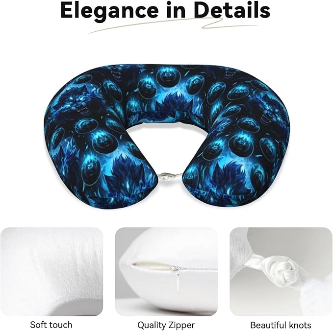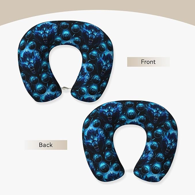 Breathable Neck Pillow for Sleeping Rest Nap Angry Wolf Blue, Airplanes/Car/Home Memory Foam Travel Cushion with Polyester Cover Washable for Women Men