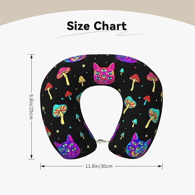 Neck Travel Pillow, Women Men Washable Airplane Car Pillows Trippy Eyes Black Cat Goth Mushroom, Head Support Rest U Shaped Cushion Comfortable for Watching TV