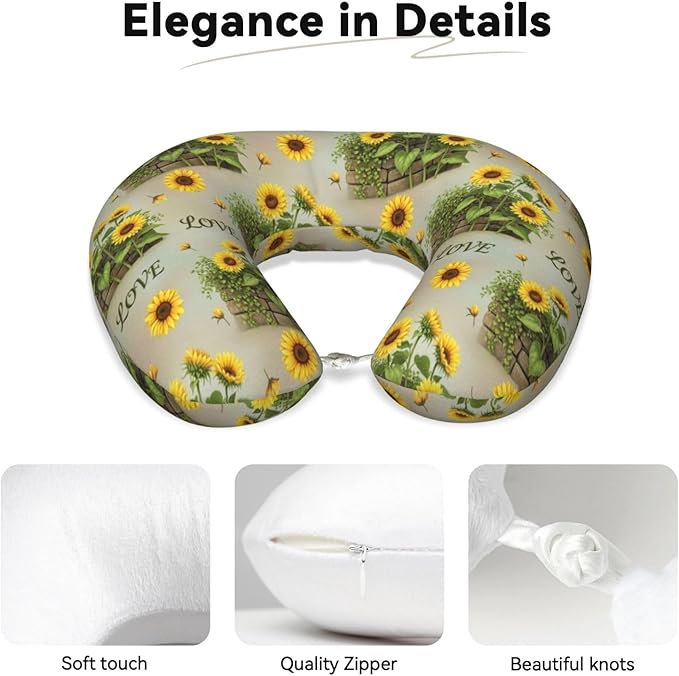 Comfortable Memory Foam Neck Pillow Retro Sunflower, Travel U Shaped Airplane/Car/Flight Pillows with Removable Zipper Cover, Chin Head Neck Support Cushion
