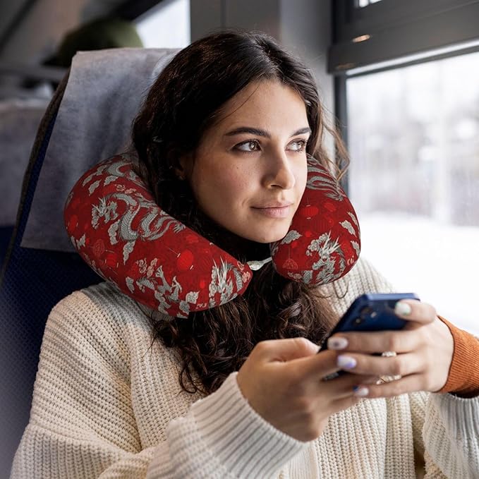 Funny Neck Pillow Support for Car Flight Rest Chinese Dragon Music Note Art, Memory Foam U Shaped Decor Head Cushion for Home Outdoors Travel