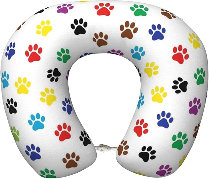 Comfortable Travel Pillow for Pain Relief Sleeping, Memory Foam Airplane Car Neck Pain Pillows Colorful Paw Prints, Funny Chin Head Support Cushion