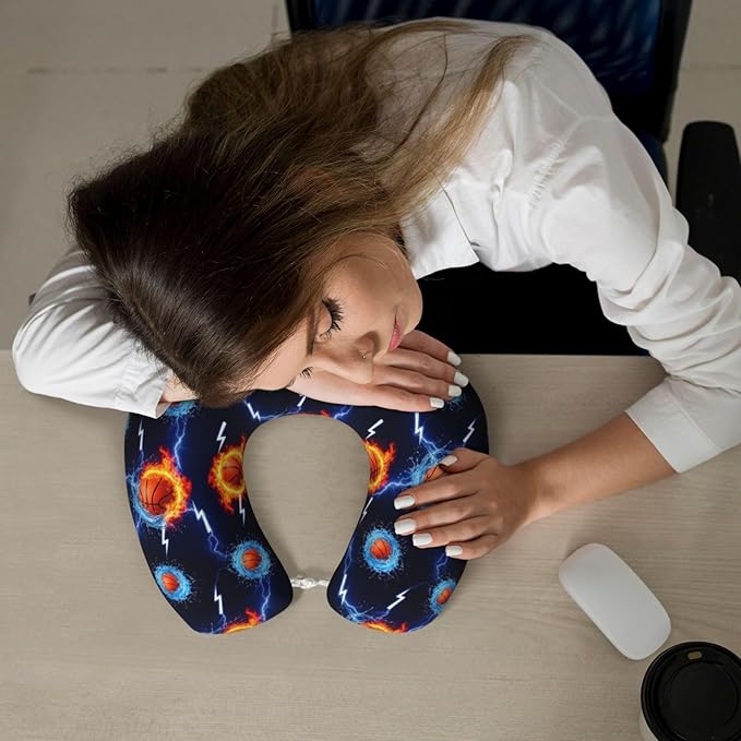 Travel Pillow for Men Women, Washable Relax U Shaped Neck Pillows for Car Head Pain Relief Sleeping Water Fire Flame Basketball Print Black