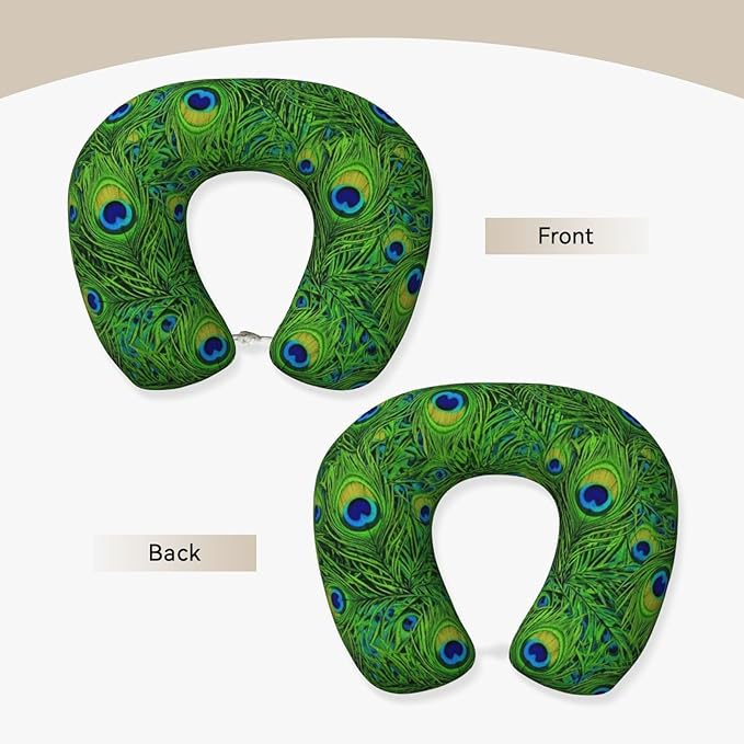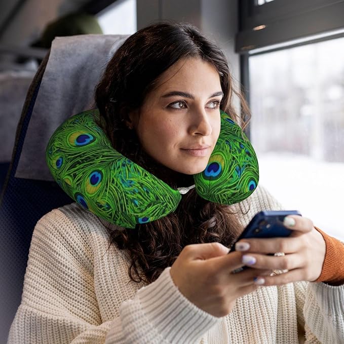 Neck Pillow Memory Foam Chin Cushion with Breathable Cover Animal Beautiful Peacock Feather Green, Cute Airplane Car Pillows for Office Head Pain Relief