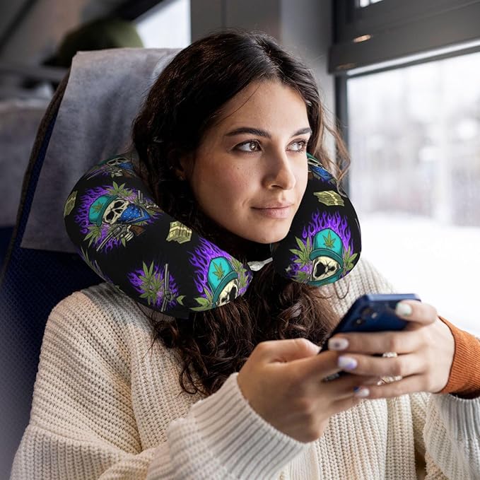Travel Pillow Chin Neck Support, Comfortable Airplane Car Pillows for Rest, Memory Foam U Shaped Office Home Nap Sleeping Cushion Purple Fire Weedleaf Dollars Skull Skeleton