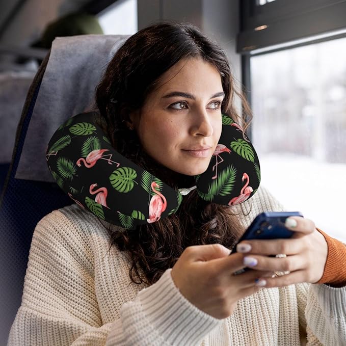 Memory Foam Airplane Pillow Pink Flamingo Tropical Palm Banana Leaves for Car Chin Head Neck Supporting, U Shape Pillows Travel Cushion for Office, Nap Sleeping