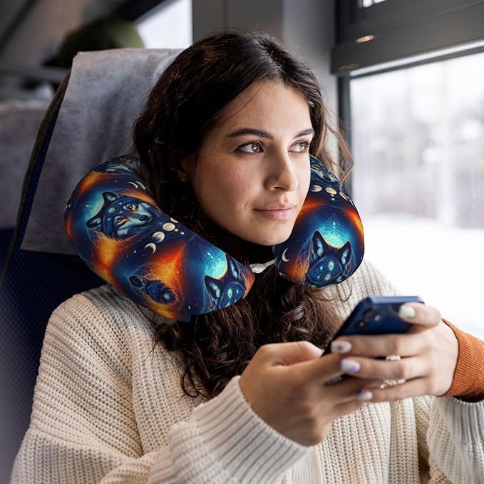 Unique Travel U Shaped Pillows Galaxy Wolf Night Sky Space Moon for Airplanes Car Flight, Comfortable Chin Head Neck Cushion Supporting, Polyester Removable Cover