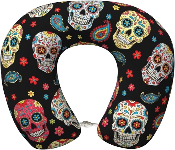 Travel Neck Pillow for Pain Relief Sleeping, Vintage Paisley Sugar Skull, Comfortable Memory Foam Chin Head Cushion Support with Zip Cover, Fashion Car Flight Pillows