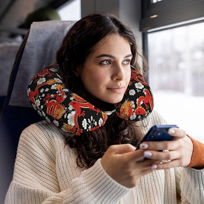 Neck Travel Pillow, Women Men Washable Airplane Car Pillows Japanese Chinese Dragon Flower Black Floral, Head Support Rest U Shaped Cushion Comfortable for Watching TV