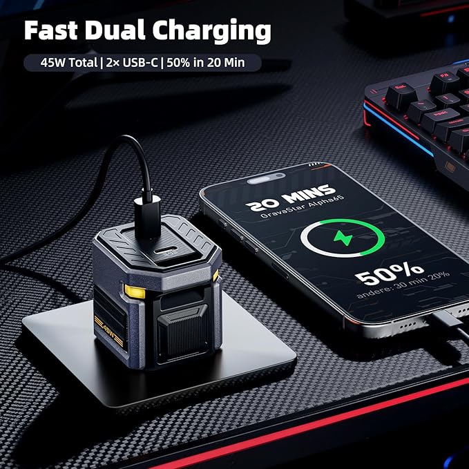 - 🔋【45W GaN Dual-Port – 20 Mins to 51%】: Next-gen GaN tech delivers 45W total output: single USB-C port fuels iPhone 17 Pro from 0-51% in 20 mins, while dual ports charge phone + iPad Pro simultaneously at full speed (no throttling). 45W hits the sweet spot for daily mobile tech—efficient, battery-friendly, and compact.