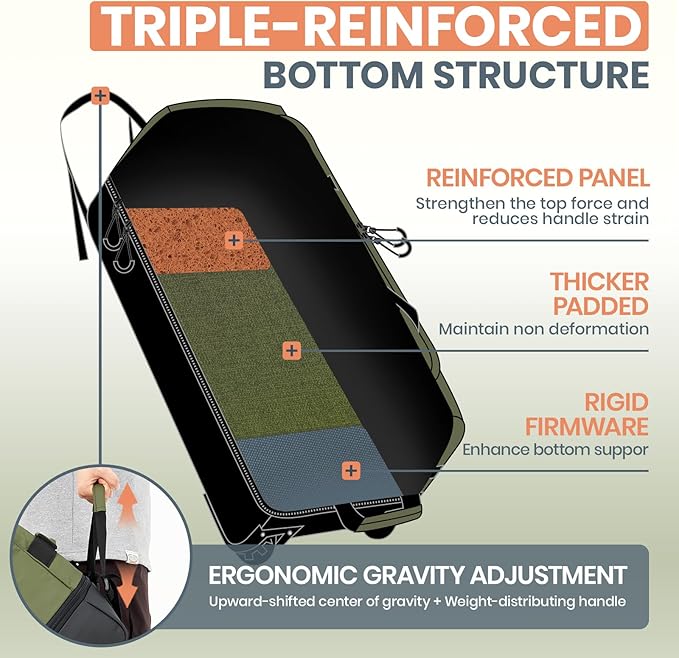 - Stable Travel Assistant: This duffel bag redefines design with innovation, upgrading the support structure to prevent deformation.Why is it more trustworthy? Its triple-reinforced bottom ensures firmness when fully loaded, solving common sagging and dragging issues. Ergonomically adjustable handle connect to the reinforced base, enhancing load-bearing capacity, shifting the center of gravity upward, and distributing weight for effortless. Let you easily pull in the most comfortable posture