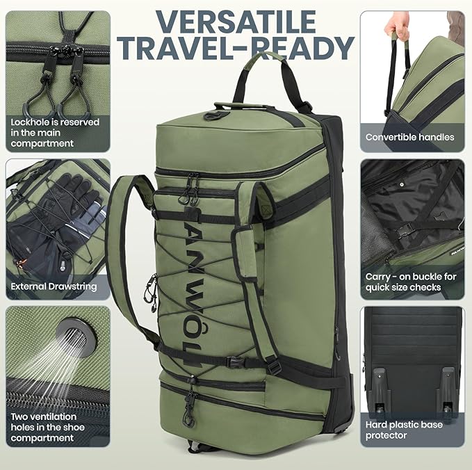 Fanwoli 85L 100L Large Rolling Duffle Bag with Shoes Compartment, 30’’ Expandable & Foldable Heavy Duty Water Resistant Travel Backpack, Convertible Foldable Duffel for Gym Camping Weekender